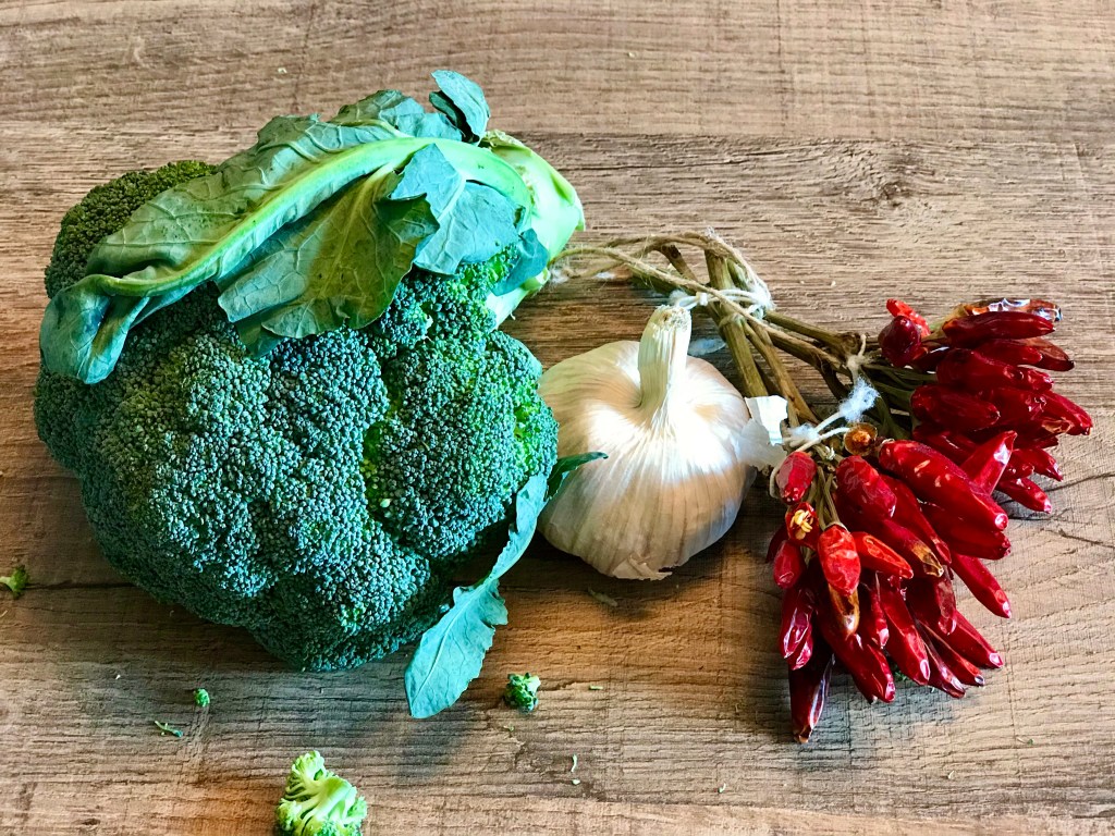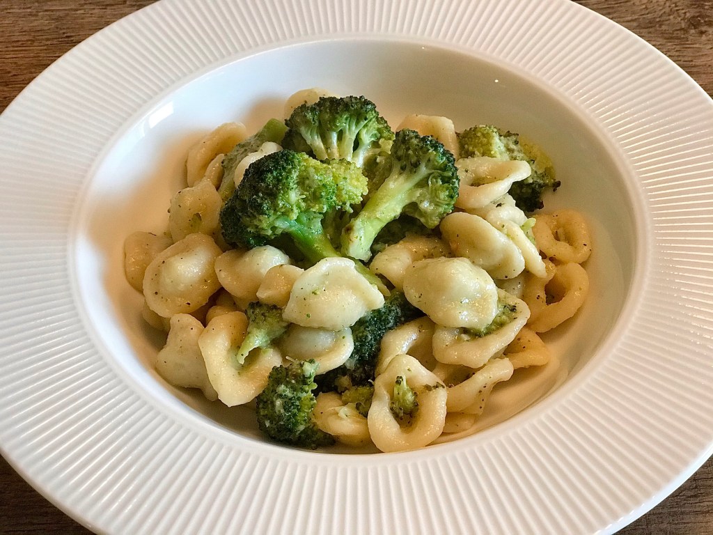 Scaldare dell’olio evo con uno spicchio d’aglio intero e un po’ di peperoncino. Aggiungere circa 500 gr di broccoli. Dopo averli rosolati, aggiungere un pizzico di sale e un bicchiere d’acqua. Cuocere per 5 minuti, quindi togliere l’aglio e il peperoncino. Poi prendere qualche broccolo che andremo a frullare con un po’ di acqua di cottura della pasta. Aggiungere la crema ottenuta al resto dei broccoli. Cuocere la pasta per 5 minuti e versarla in padella.